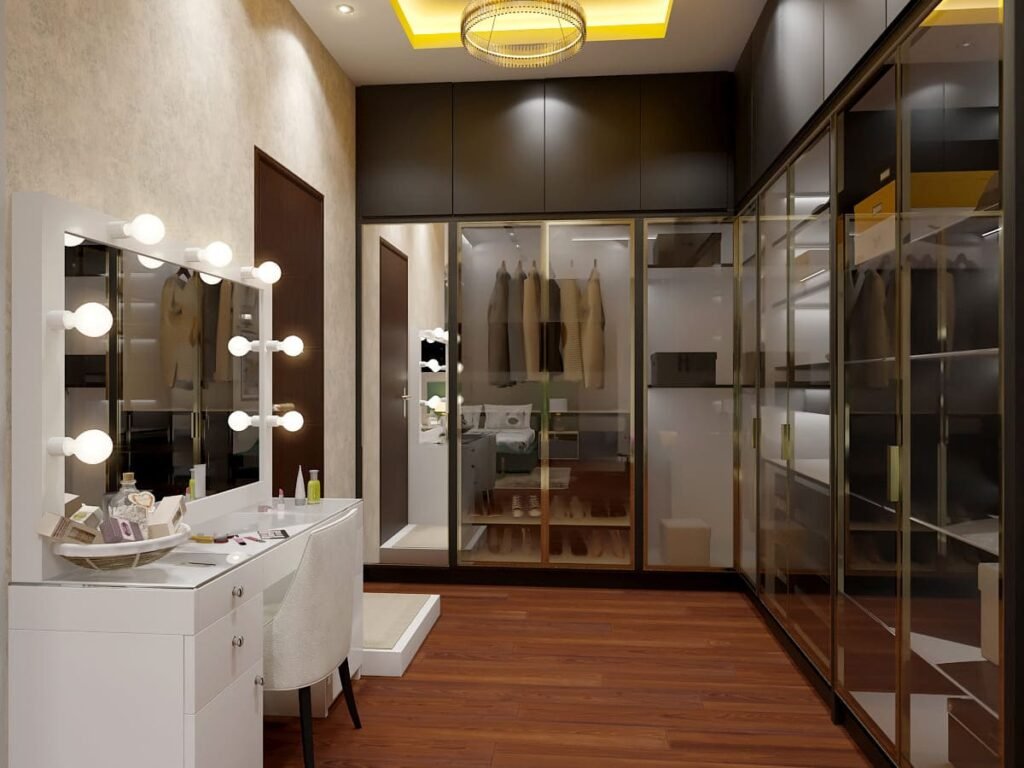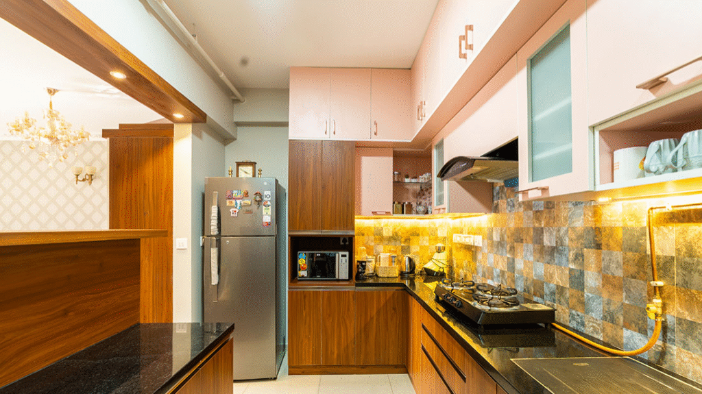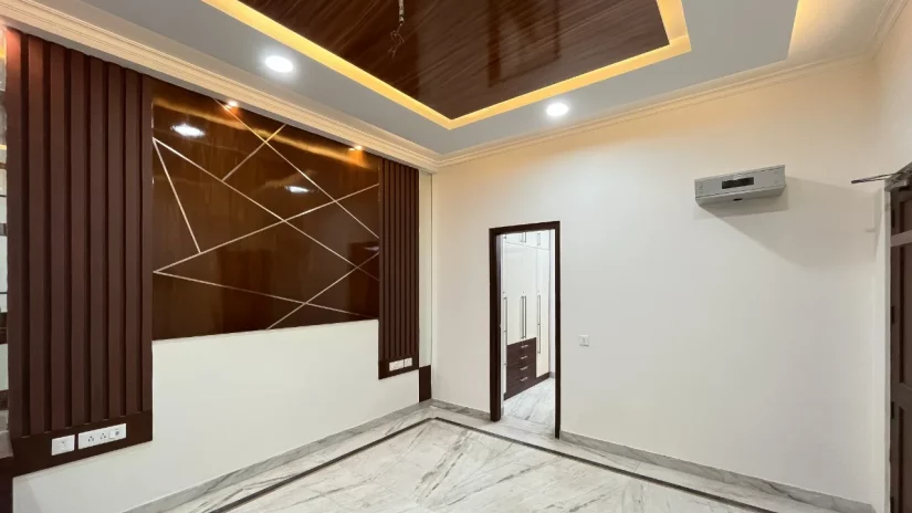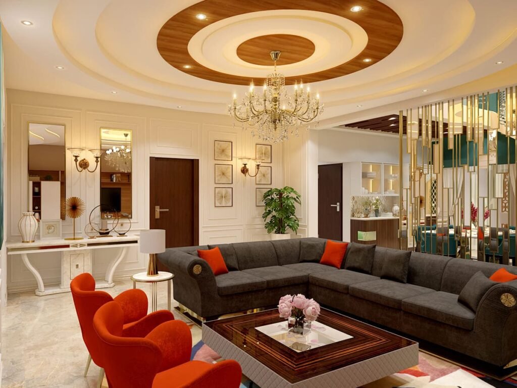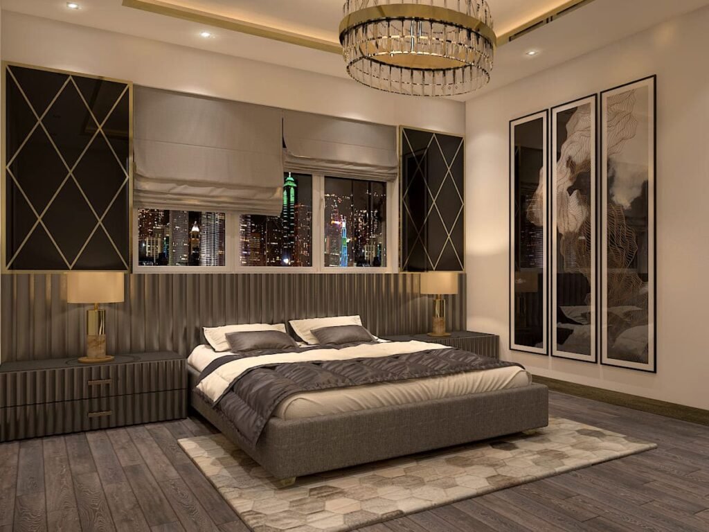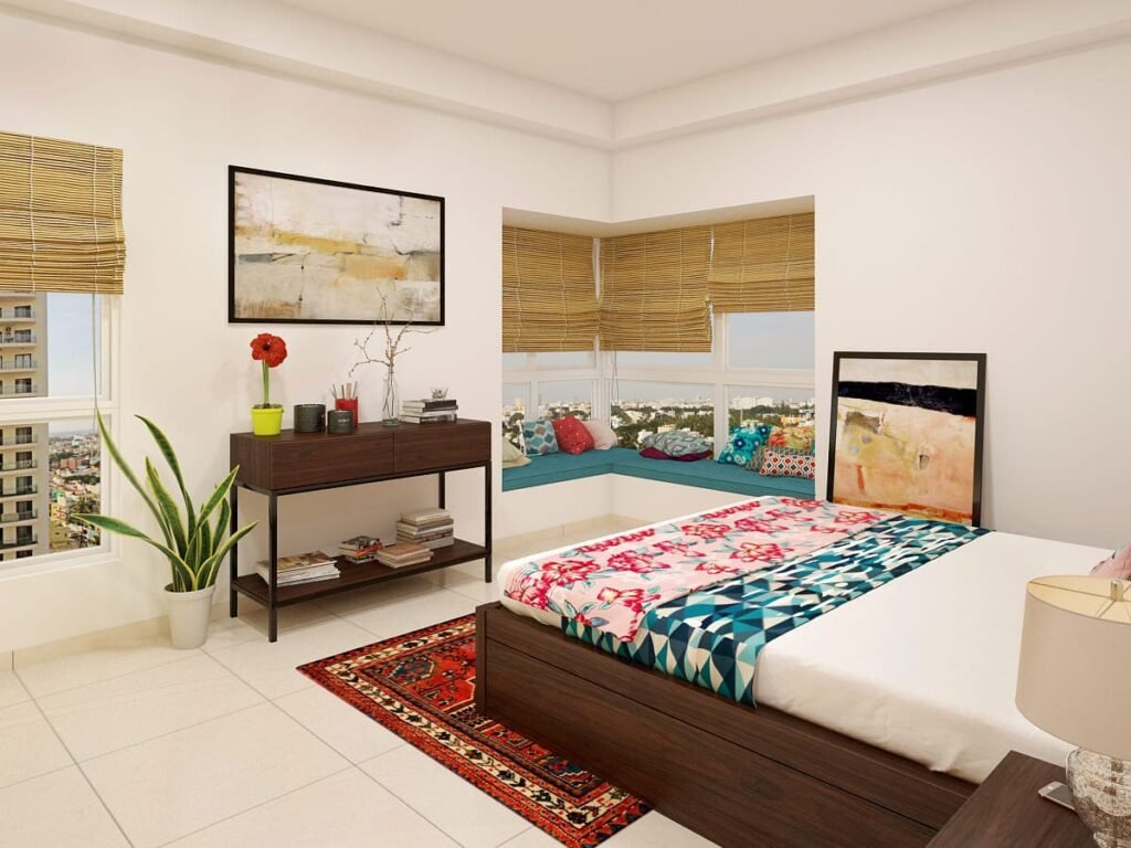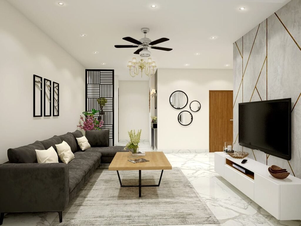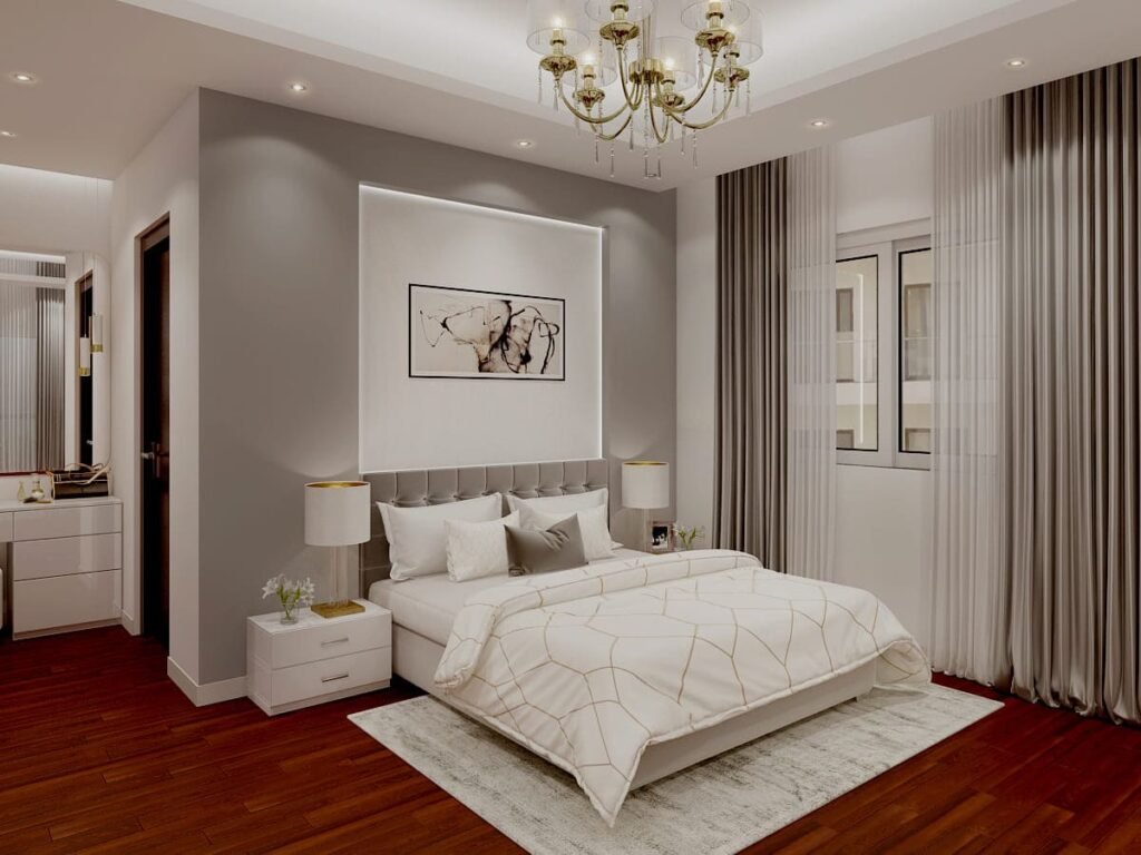 We turned every room into a white canvas to give that luxurious look with a tinge of brass and grey. The Italian marble flooring in cream, light rugs with a subtle design and colour, voila! Grey sofa with white and grey cushions to match the curtains and black floor lamp in the living room. A minimalistic approach in the bedroom with a sliding door used for the wardrobe and soothing white, grey and golden tones used everywhere. A spacious puja room where you can feel the serenity and peace as soon as you enter. Elegant chandeliers, cube clean modern furniture and stylish lamps. Personally, we kinda fell in love with the kitchen!
