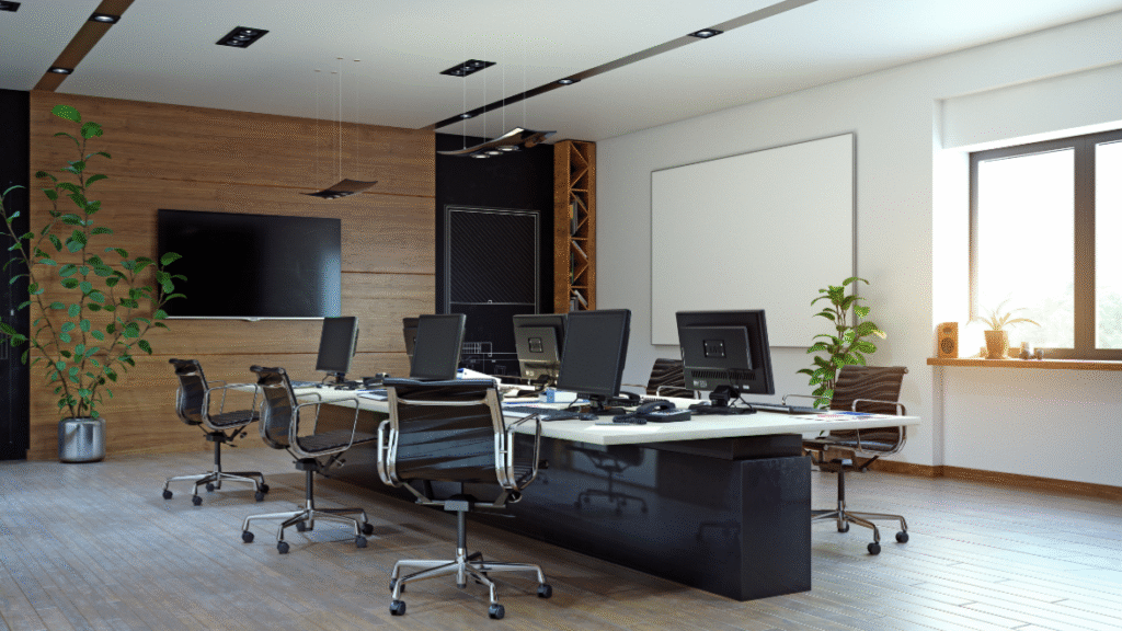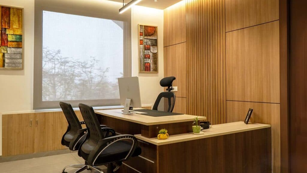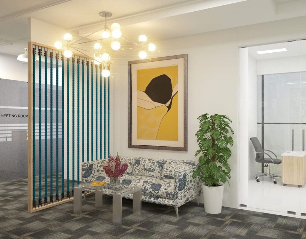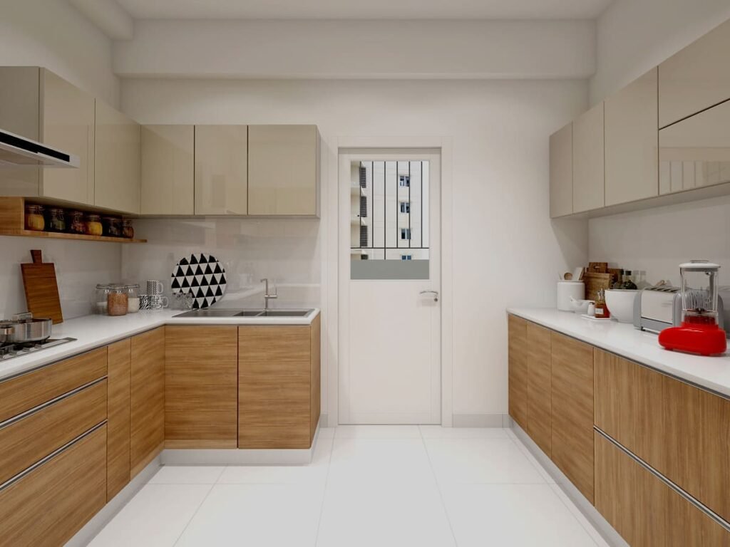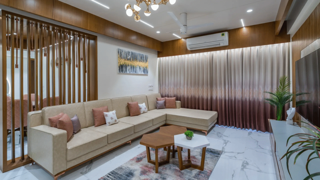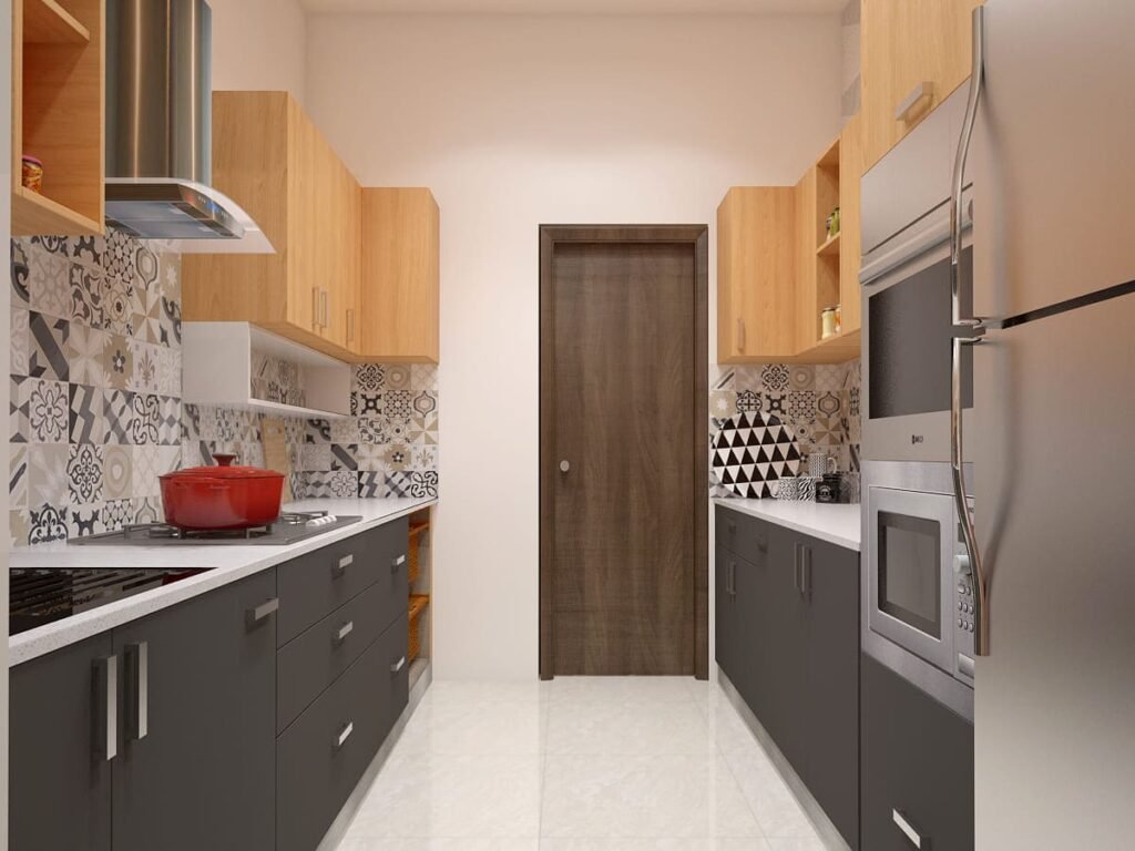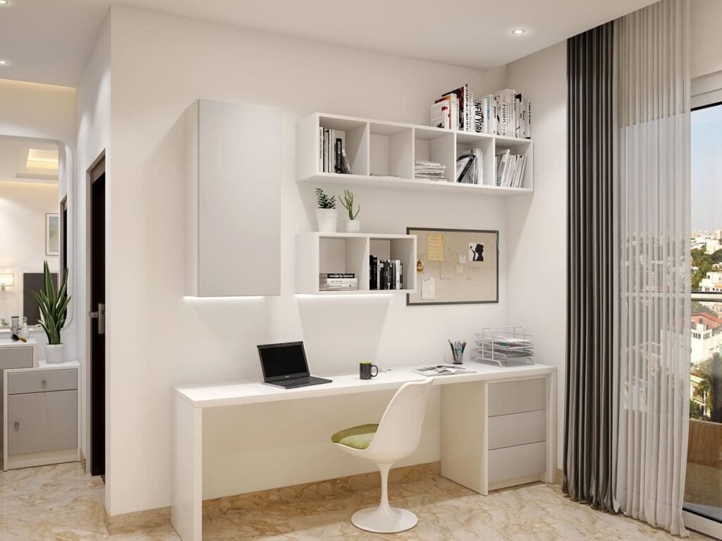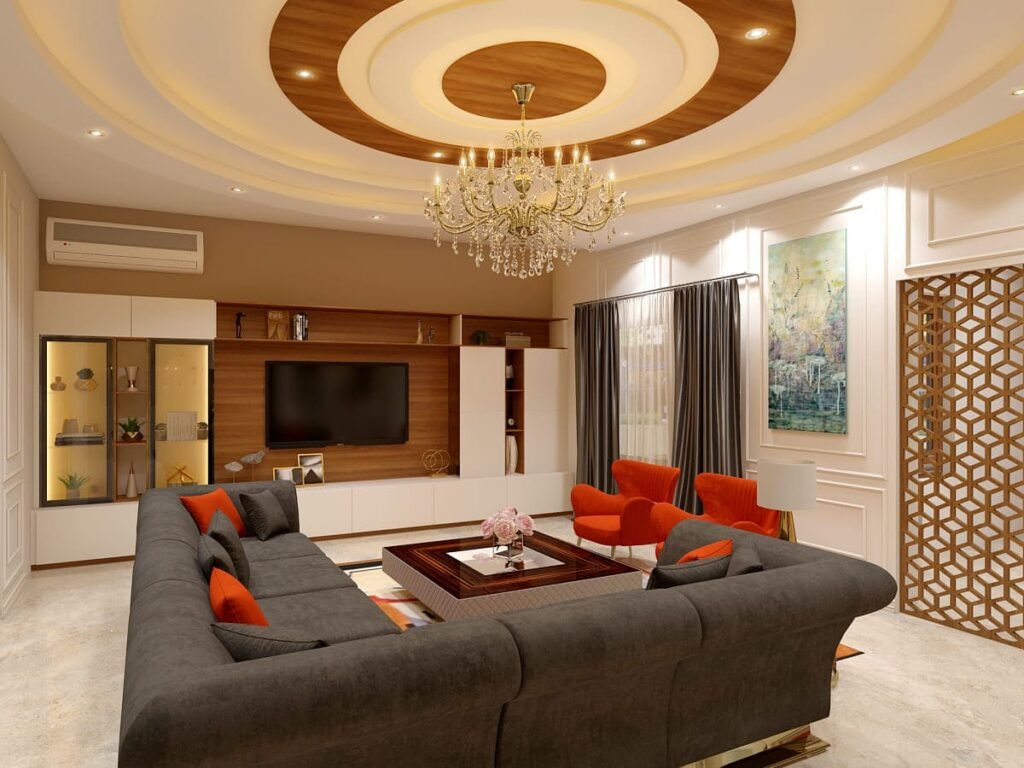 Our design team blended beige and greys with white to give that spacious look. The peach nook is perfect for reading or putting on some great music to relax in the evening. Stylish study desks, loads of cabinets and wardrobe space. Modular kitchen that has everything neatly tucked into the compact space. The living room is uber classy, grey sofa, glass table and wonderfully designed walls. Warm lighting, simple and neat looking TV unit and elegant wall shelves. Monstera Deliciosa and Snake Plant spreading freshness placed all around the room, abstract pattern carpet all grouped in for the budget-friendly duplex.