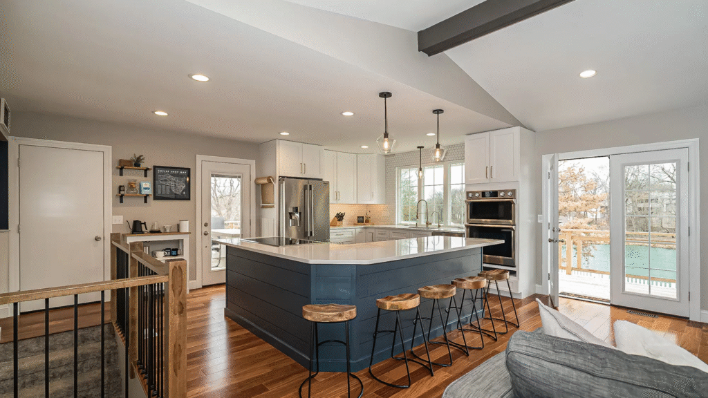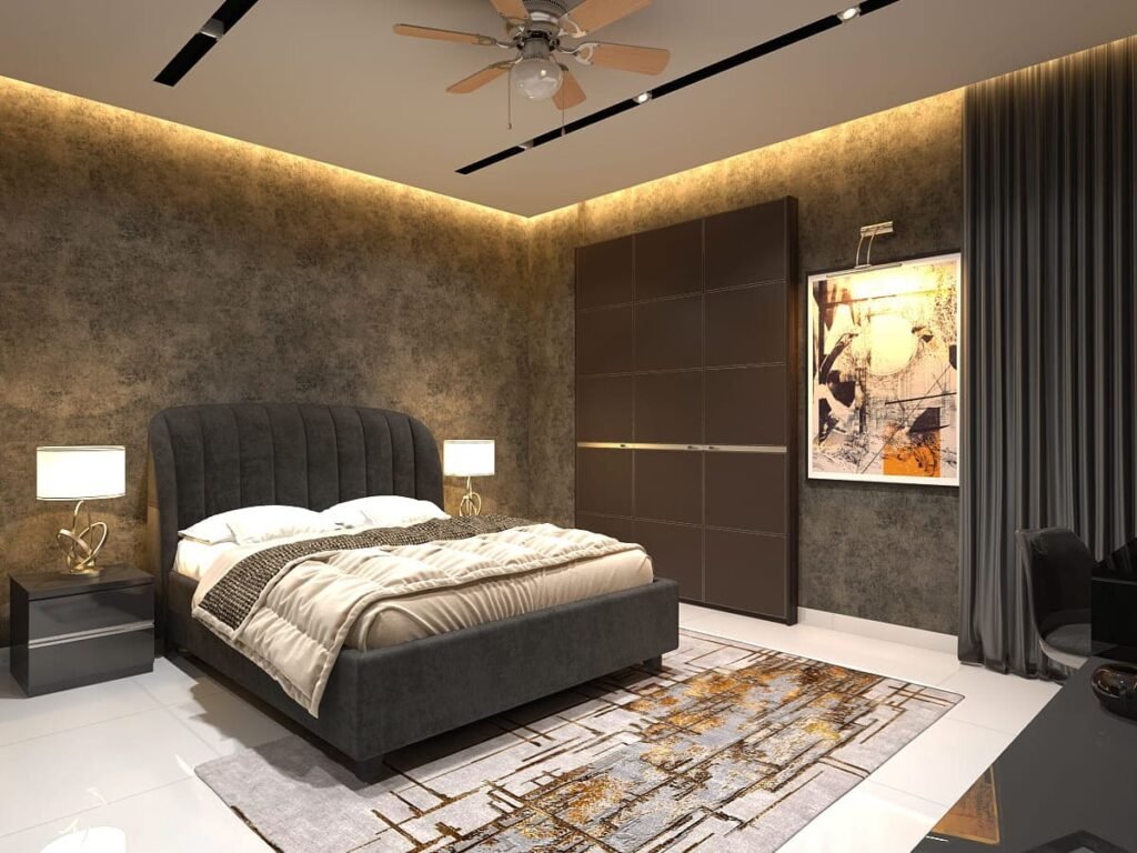 This super spacious duplex demanded all the grandeurs of the universe. Golden tones with classy interiors, a modern and classical fusion in the study room. Abstract patterns, neat and spacious rooms with bold and glamorous interiors. A lovely dining area, mesmerising staircase next to a dark toned wall sprinkled with black and white frames, fresh blue carpet and deep green chairs. A fancy study room, super-spacious kitchen with all the amenities and a seductive living room. Red chairs with grey sofa, gold, white and brown interiors. A chandelier that showers sparkle, stole our heart. The vibrant kid’s bedroom turned out exactly as we intended, check out that cool map on their wall!